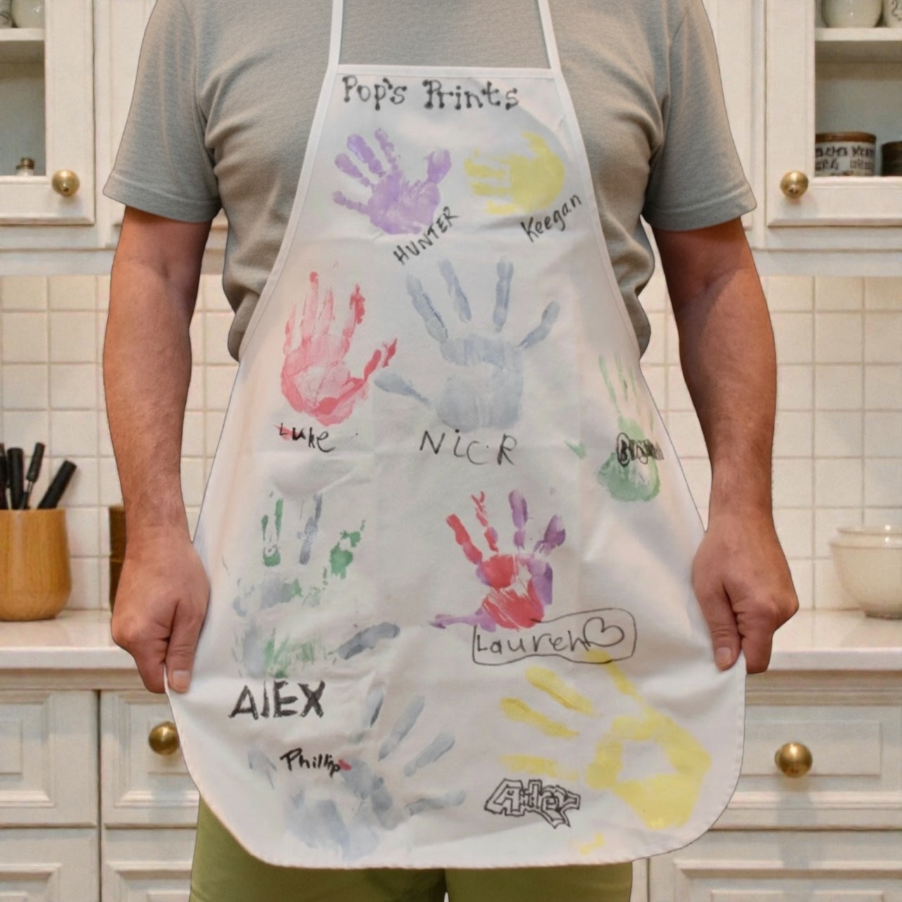 This handprint apron kit is perfect for families looking to have fun and create lasting memories together. It's ideal for parents wanting to capture their children's growth through handprints, pet owners who want to include their furry family members, and anyone seeking a meaningful activity shared together that results in a treasured keepsake. The finished apron and tote bag makes a heartfelt gift for grandparents, other family members, or can be kept as a personal reminder of precious moments with your loved ones.